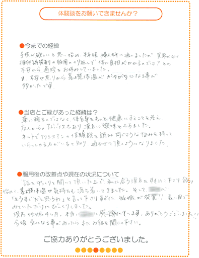 薬に頼るのではなく、体自身をもっと健康にすることを考え、友人からのアドバイスもあり漢方に興味を持ちはじめました。ネットでアクシスアンの体験談を読み同じような悩みを持っていらっしゃる方がいると知り、通わせて頂くようになりました。