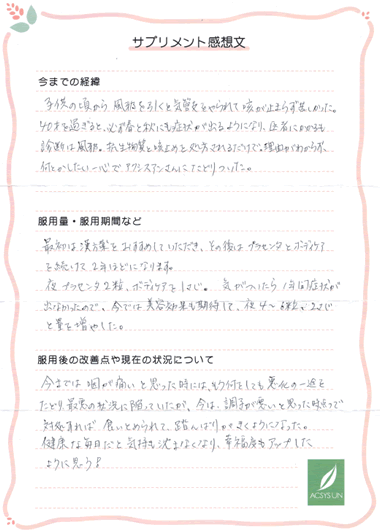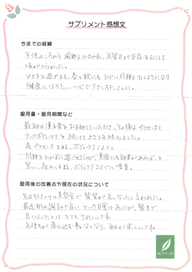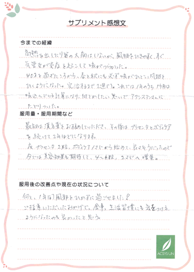 最初は漢方薬をおすすめしていただき、その後はプラセンタとボディケアを続けて2年ほどになります。